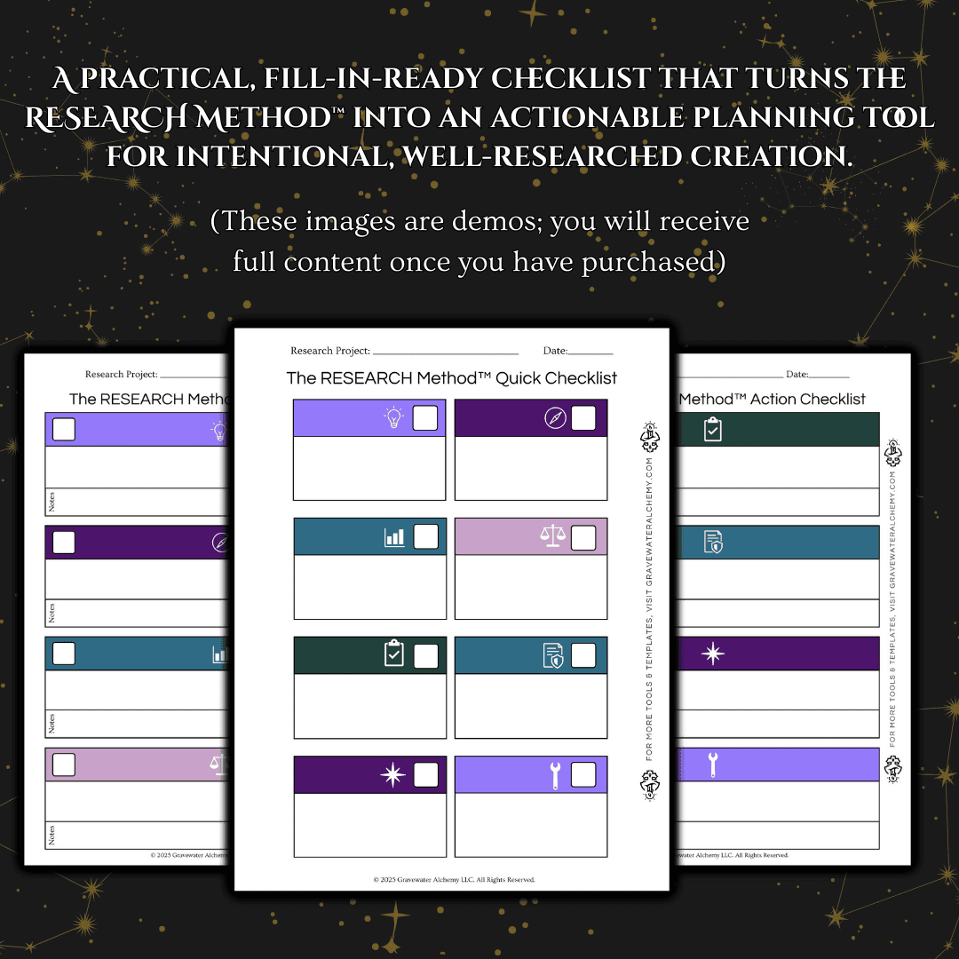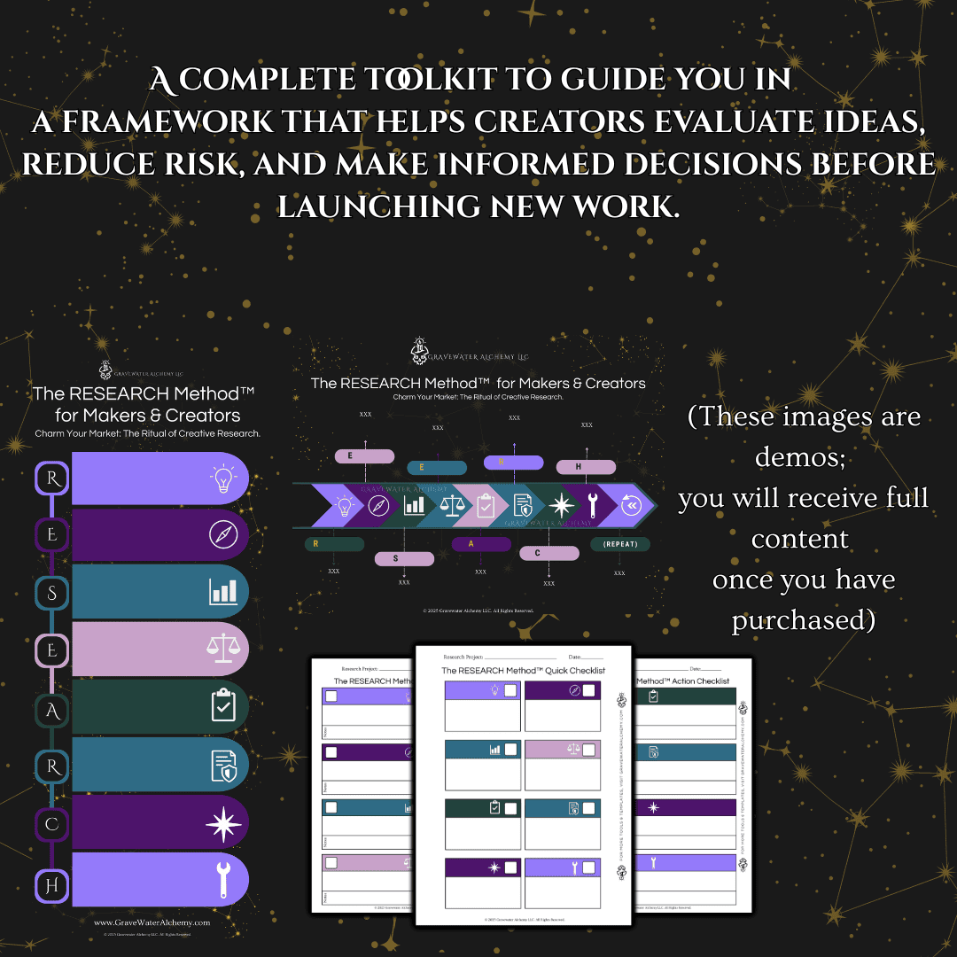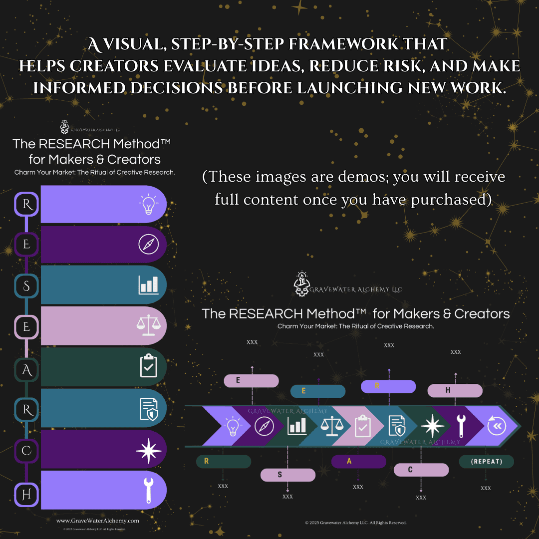 Paired with the Spellbook is The RESEARCH Method™ — a visual, step-by-step framework that helps creators evaluate ideas, reduce risk, and make informed decisions before launching new projects. Rather than replacing creativity, the method supports it by providing structure, reflection, and clarity.