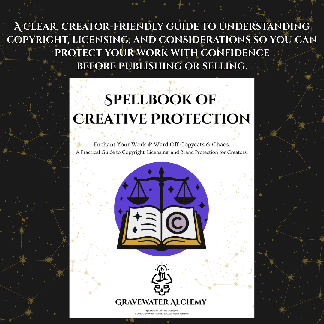 This collection blends educational guidance with structured planning tools. The Spellbook of Creative Protection introduces creators to core concepts around copyright, licensing, and creative safeguards in a clear, approachable way. It is designed to reduce confusion, demystify common concerns, and help creators feel grounded before publishing or selling their work.