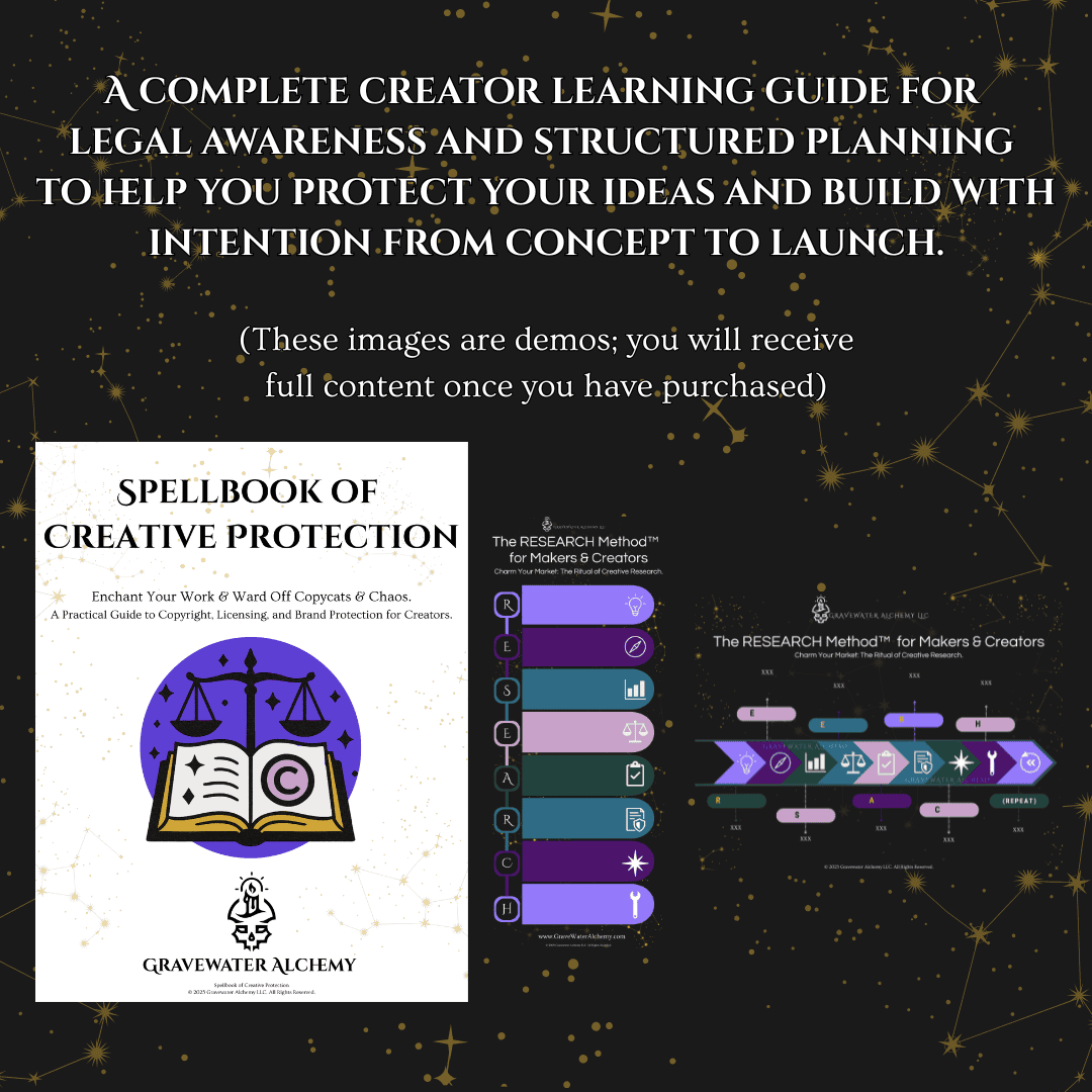 Spellbook of Creative Protection & The RESEARCH Method™ is designed to replace guesswork with clarity. Rather than reacting to problems after they arise, this toolkit helps creators think ahead — protecting their work, reducing uncertainty, and building with confidence.